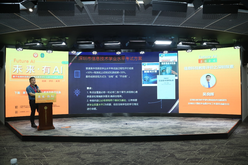 深圳市教育科学研究院信息科技教研员、深圳市计算机学会青少年工作委员会副主任吴良辉老师的报告主题是《信息科技教育评价之深圳探索》,他介绍了深圳市在信息科技教育评价领域的创新实践。