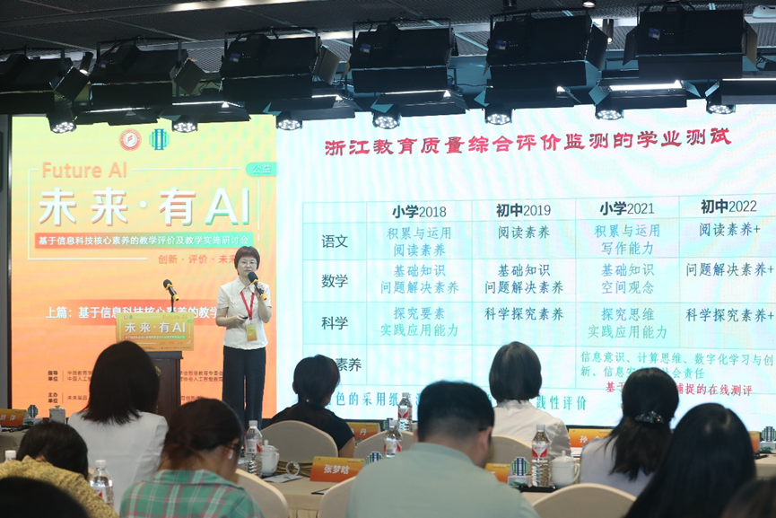 接下来,浙江省教育厅教研室信息技术教研员、教育部普通高中信息技术课程标准研制组成员魏雄鹰老师在题为《聚焦信息科技素养,探索多元评价新路径》的演讲中,分享了关于多元评价的新思路与实践路径。未来基因(北京)人工智能研究院资深专家,清华大学教育研究院周丹博士就《核心素养导向的信息科技评价实践》进行了深入剖析,探讨了利用未来基因(北京)人工智能研究院开发的“爱测评”智能评价平台,如何将核心素养理念更好地融入信息科技的教学评价之中。